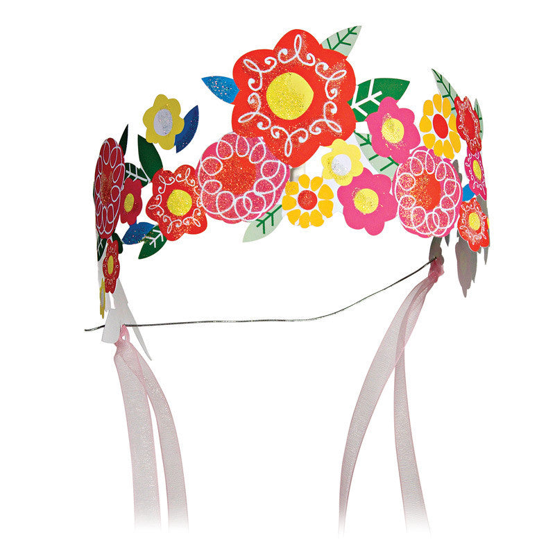 These tiaras are beautifully designed, decorated with a floral pattern in bright colors, picked straight out of the fairy garden! Each tiara is tied with a pink sheer ribbon and gold twine.